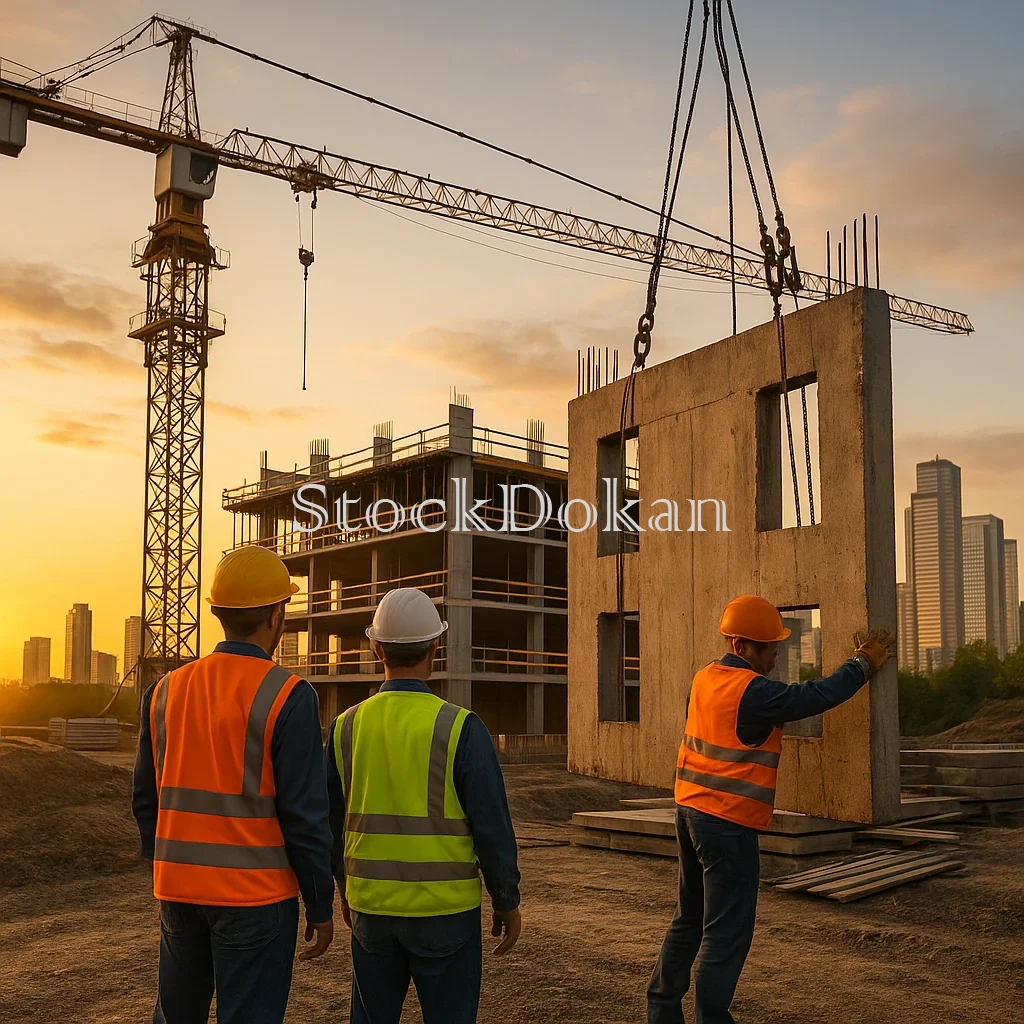 Bring authenticity to your construction, real-estate, or B2B projects with this high-resolution construction stock photo. The scene shows three workers in safety gear guiding a tower crane as it lifts a precast concrete panel at an active job site. Warm sunrise light adds depth and contrast, while a modern city skyline sets a professional, urban tone. The composition is carefully framed to keep the workers, crane boom, and concrete wall as focal points, making the image versatile for website hero sections, landing pages, pitch decks, blog headers, brochures, and ad creatives.