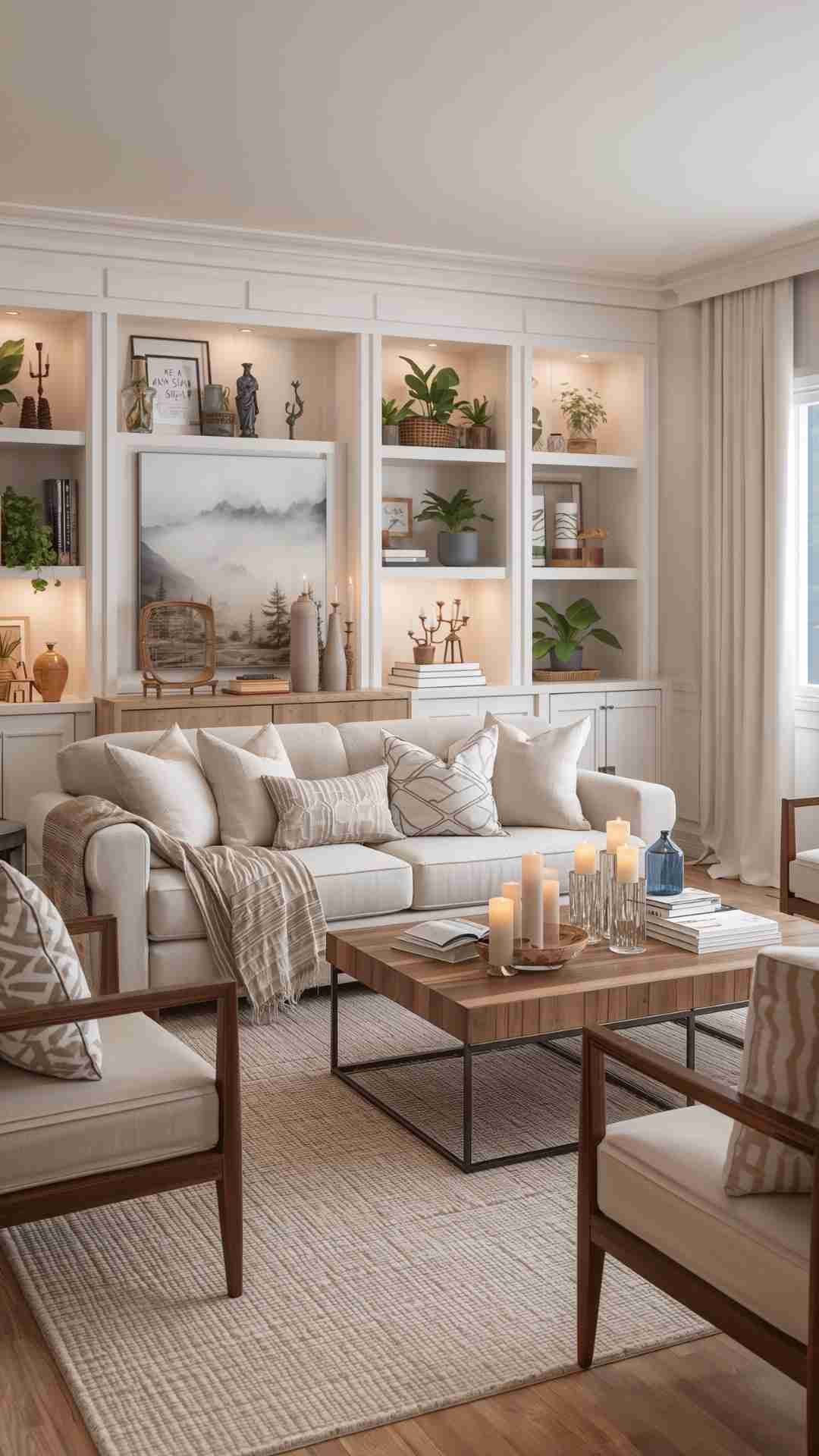 Give your projects a warm and stylish look with this cozy living room decor portrait stock photo. The scene is designed to feel like a spread from the best home decorating magazines and top interior design magazines, mixing modern elegance with everyday comfort. A soft fabric sofa with layered pillows, a wooden coffee table, decorative candles, plants and wall art come together to create a welcoming room decoration idea that works for many home styles.