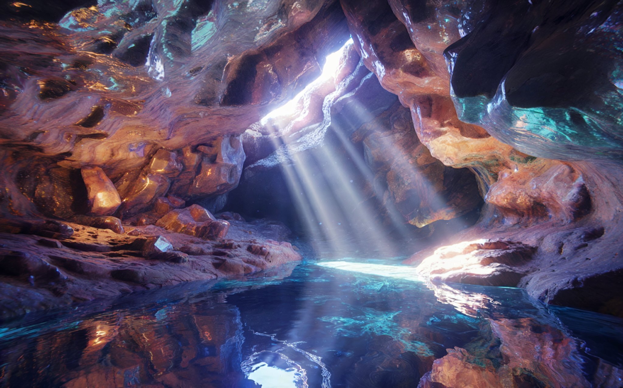 sunlight beams through a crystal cave illuminating blue water and glowing rocks (CC0)