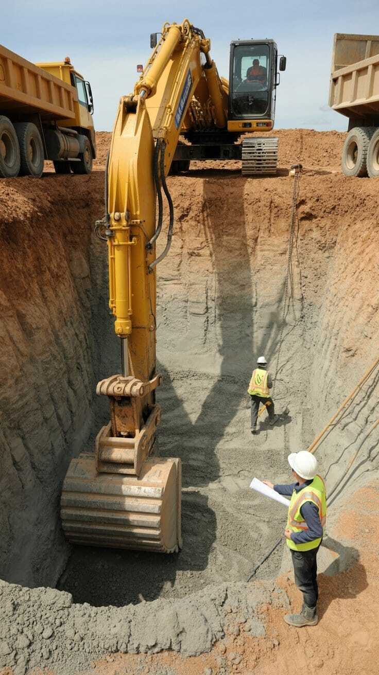 This realistic photograph captures the coordinated intensity of large-scale earth-moving and excavation operations, documenting the essential heavy machinery and skilled workforce required for major infrastructure development projects. The composition features a massive bright golden-yellow excavator prominently positioned at the center-left, its substantial boom arm extended upward with the bucket poised in mid-air, showcasing the impressive scale and hydraulic power of modern earthmoving equipment. The excavator’s robust undercarriage with thick metal treads sits firmly on exposed soil, while its operator cabin is visible with an operator present during active operations. Multiple dump trucks positioned on either side of the excavation pit—finished in warm golden-tan and muted brown tones—demonstrate the coordinated material transport workflow. Construction workers in high-visibility lime-green and yellow safety vests with white hard hats maintain safe supervisory positions within the active excavation zone, exemplifying rigorous safety protocols. One worker in the foreground stands prominently with visible blueprints or documentation, highlighting the planning and coordination essential to complex earthmoving projects. This free industrial photograph authentically represents heavy equipment operations, large-scale construction logistics, and the professional coordination required for major infrastructure development.
