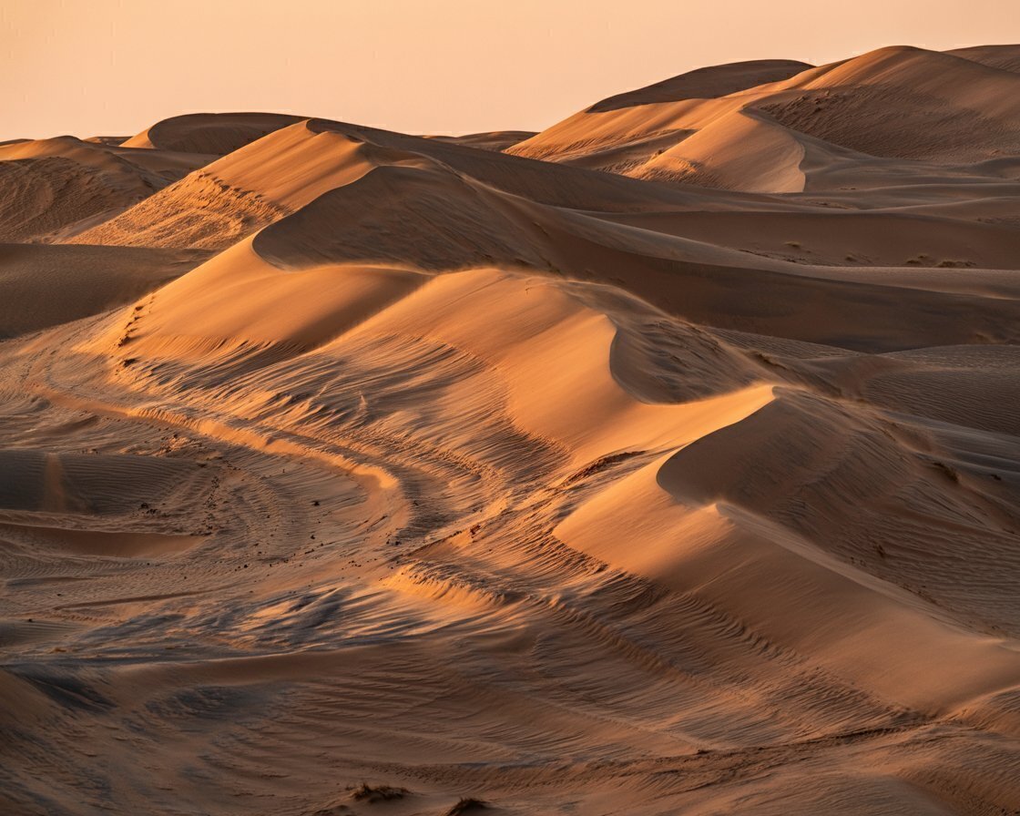 Golden light brushes across rolling desert dunes at sunset. A tranquil 4K landscape wallpaper that captures the serene beauty of shifting sand patterns.