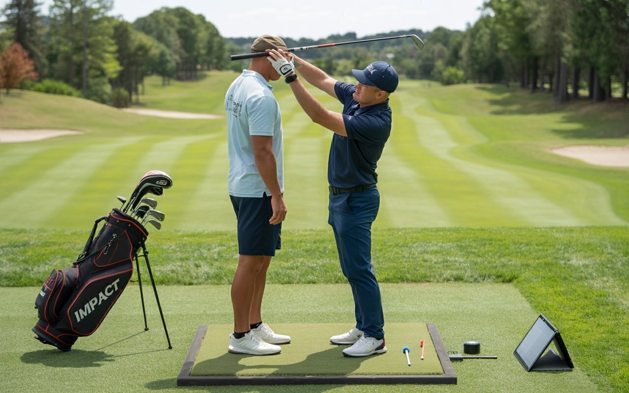 Download this professional golf coaching wallpaper capturing a golf instructor adjusting a player’s swing posture during a sunny training session on a lush green course. The detailed focus on instruction and technique reflects discipline, mentorship, and skill development. This sports education photograph is ideal for golf academies, trainers, and enthusiasts who appreciate precision and teamwork.