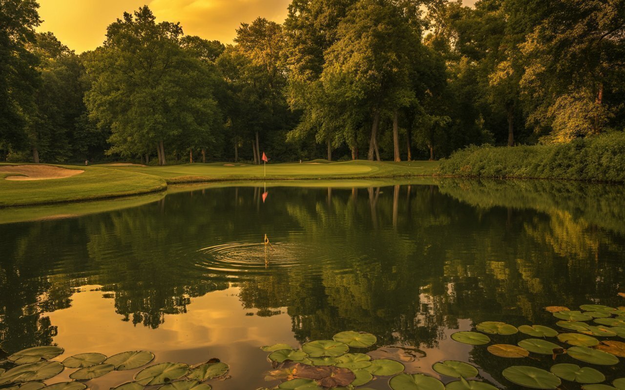 Download this serene golf course sunset wallpaper featuring a tranquil lake reflecting the evening sky and lush green surroundings. The golden hues of the sunset illuminate the landscape, creating a peaceful and balanced scene. This nature landscape wallpaper evokes calmness and focus — ideal for nature enthusiasts and golfers alike. Perfect for desktop wallpapers, web backgrounds, and digital projects that seek a natural yet refined tone.