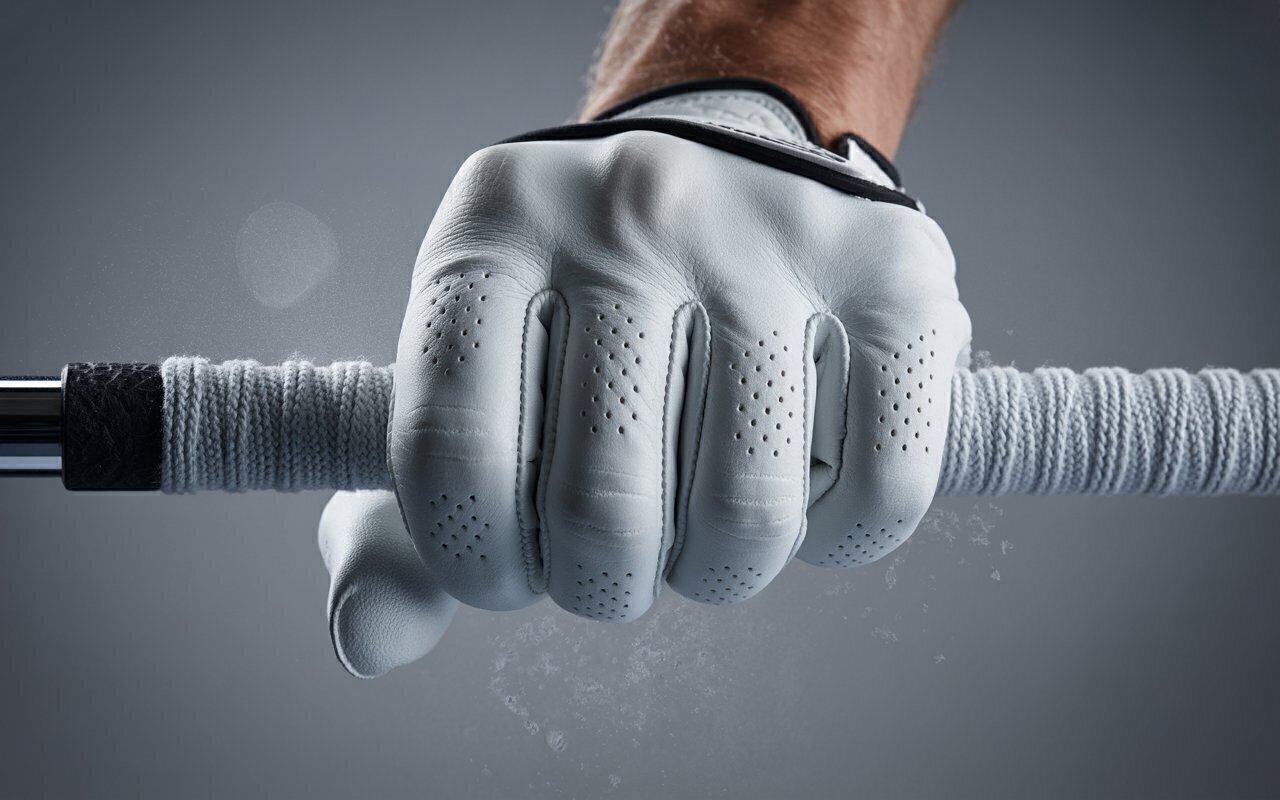 Download this high-detail golf glove grip wallpaper featuring a close-up of a golfer’s hand firmly holding the club handle. The soft lighting emphasizes the glove’s texture and precision of the grip, symbolizing strength and control in the game. This sports macro photograph captures the essence of focus and discipline — perfect for golf enthusiasts, brands, and creative designs.