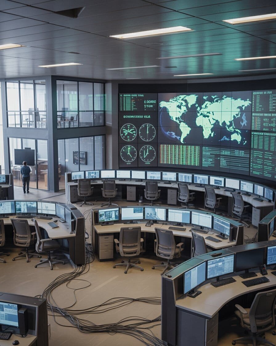 High-Tech Global Operations Command Center with Multiple Display Screens