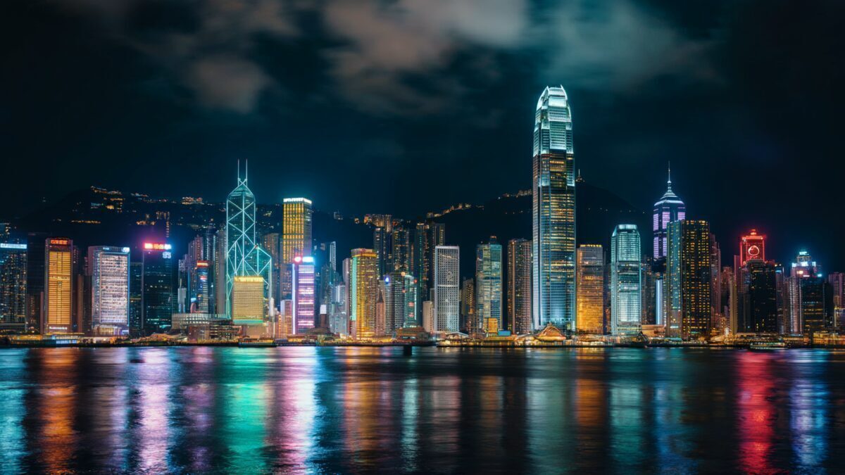 A stunning panoramic view of Hong Kong’s iconic skyline at night. Skyscrapers glow with vibrant blue, gold, and red lights, casting colorful reflections onto the calm Victoria Harbour waters. Moody clouds drift above the illuminated city, creating a dramatic and modern urban atmosphere.