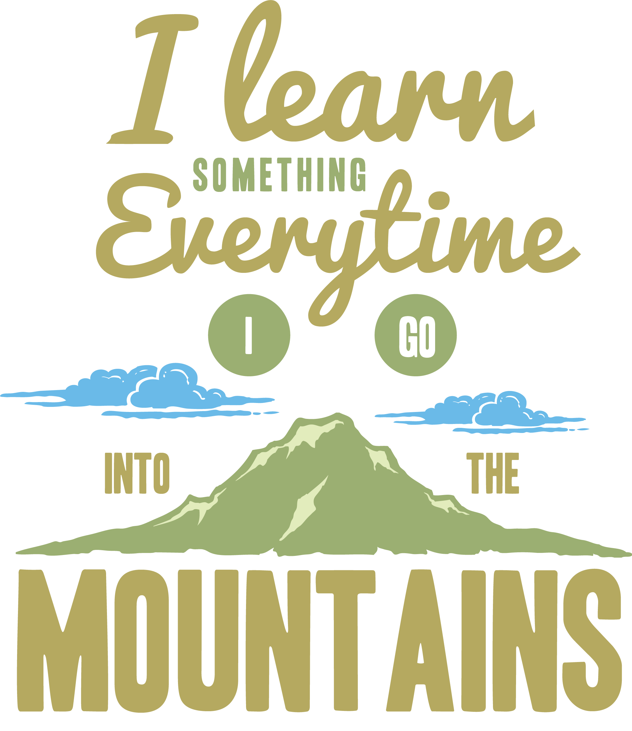 I Learn Something Everytime I Go Into The Mountains is a motivational outdoor typography design featuring a clean mountain illustration and soft vintage-style colors. The layout highlights the inspiring message with bold lettering, clouds, and a mountain landscape—perfect for hikers, campers, travelers, and nature lovers.