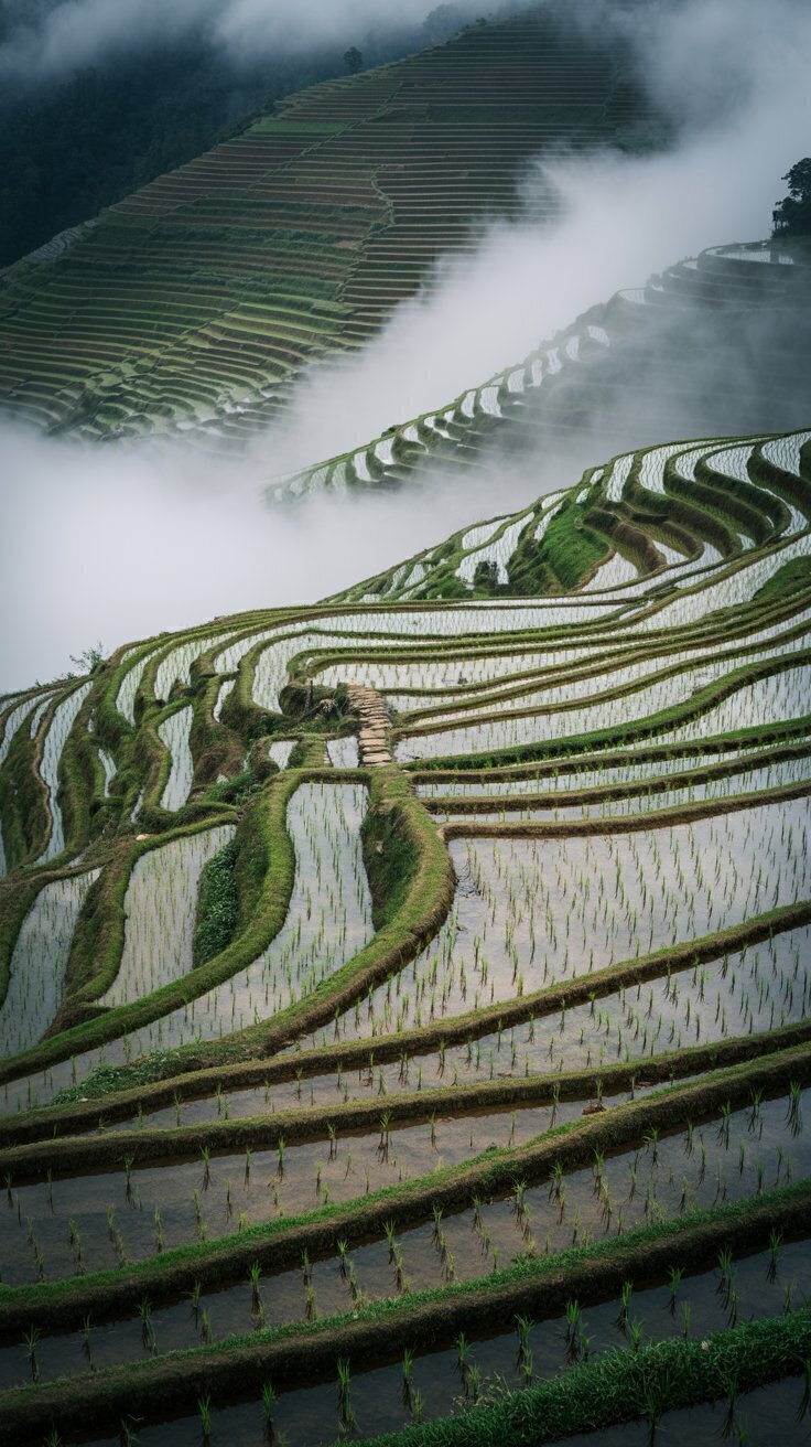 This cinematic photograph captures the breathtaking beauty of misty rice terraces cascading down a mountainside. The fog drifts through the layered paddies, creating a dreamy and atmospheric landscape. The curves of the terraces lead the viewer’s eye across the frame, highlighting the craftsmanship and tradition behind these ancient agricultural formations.