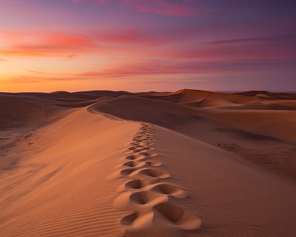 Download this Sahara desert wallpaper featuring golden dunes under a brilliant sunset sky. The wind-sculpted sand and fading footprints evoke solitude, peace, and the passage of time. The vivid pink and orange hues of the horizon bathe the dunes in warm light, creating a breathtaking sunset desert wallpaper perfect for travel lovers and dreamers alike.