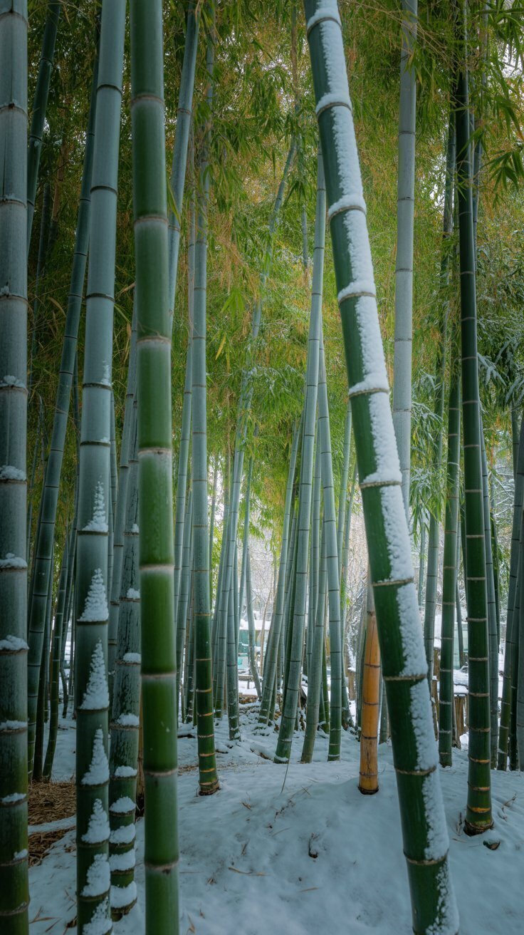 Download this beautiful snowy bamboo forest wallpaper featuring tall green bamboo trunks dusted with fresh winter snow. Soft light filters through the dense grove, blending cool tones of ice with the natural greens of the bamboo. The quiet, serene atmosphere makes it perfect for meditation themes, minimalist nature designs, and calming digital backgrounds.