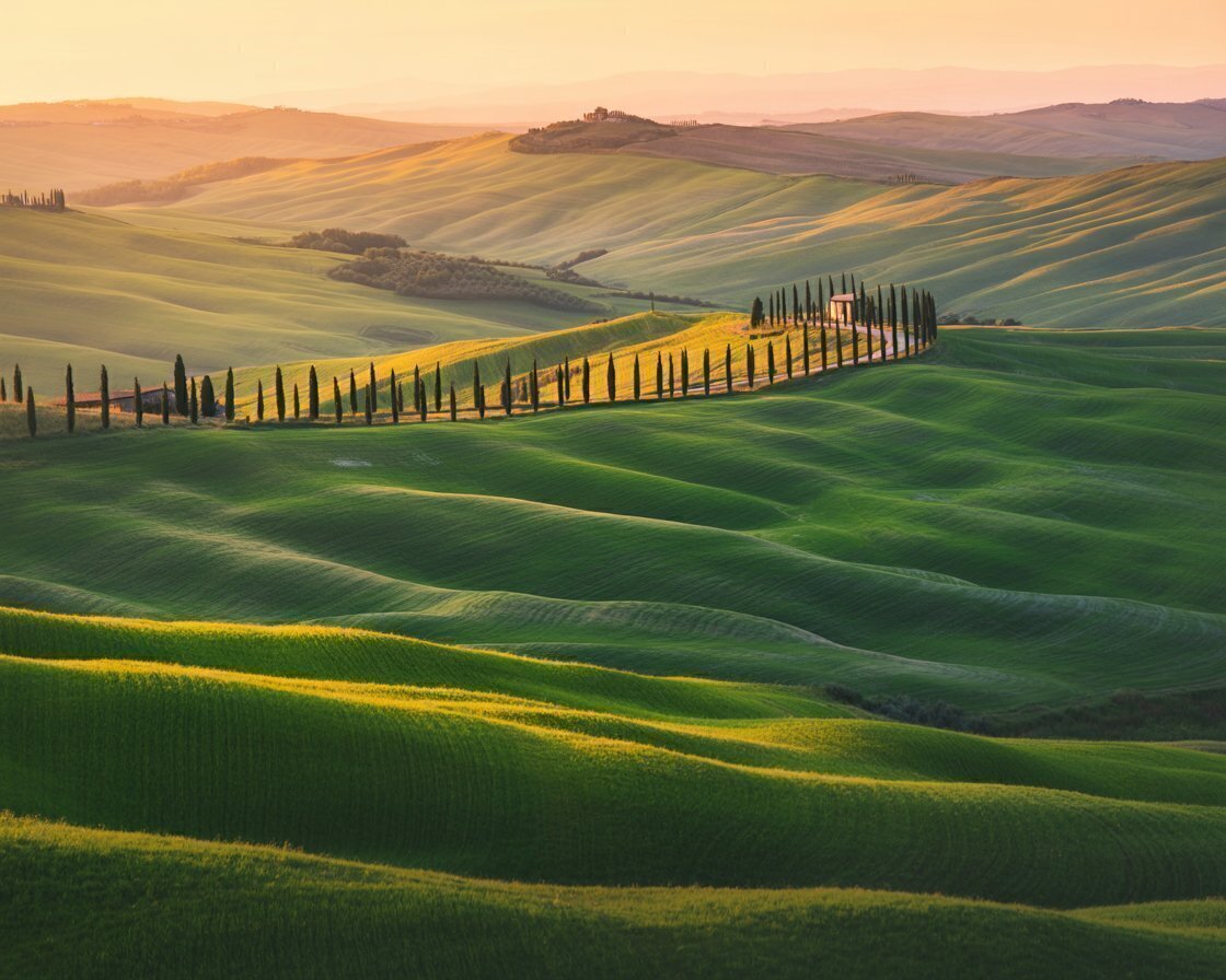 Download this Tuscany hills wallpaper featuring the golden evening light sweeping across emerald fields and winding cypress roads. This stunning Italian landscape wallpaper evokes peace, elegance, and natural harmony — a perfect tribute to the charm of rural Tuscany. Every curve and shade glows under the soft sunset, making it ideal for travel, nature, or relaxation themes.