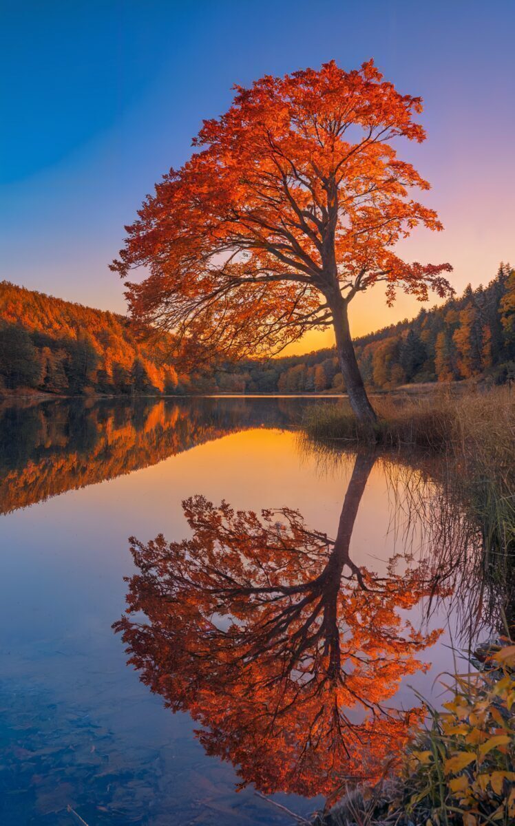 This free stock photo captures the essence of autumn in a serene lakeside setting. A magnificent deciduous tree, ablaze with fiery orange and red foliage, leans gracefully over the water from the right bank. Its dark, textured trunk contrasts beautifully with the bright canopy. Beneath it, the calm lake acts as a perfect mirror, creating a stunning symmetrical reflection of the tree and the surrounding landscape.