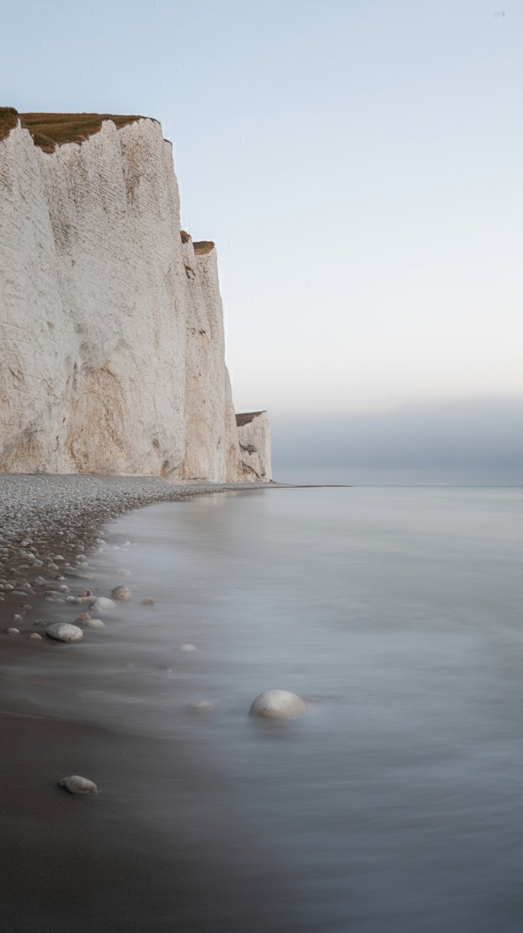 Download this stunning white cliffs seaside wallpaper featuring towering chalk cliffs set against a smooth, misty shoreline. The soft pastel sky, gentle waves, and polished coastal stones create a minimalist, calming atmosphere. This serene coastal landscape is ideal for desktop backgrounds, mobile wallpapers, and creative design projects needing a clean, airy nature aesthetic.